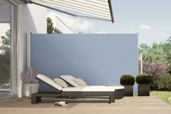 Store vertical avec coffre petit format, protège du soleil bas, des regards indiscrets et du vent. Idéal sur le devant ou sur le côté d’un toit de terrasse.