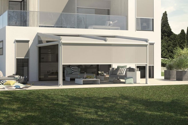 Store de véranda sous toit avec note conviviale. Un système d’ombrage fiable offrant une climatisation naturelle et préviennant les éblouissements, transformant les rayons du soleil éclatant en une fabuleuse ambiance lumineuse.