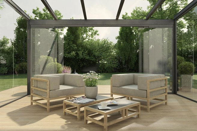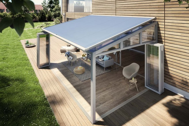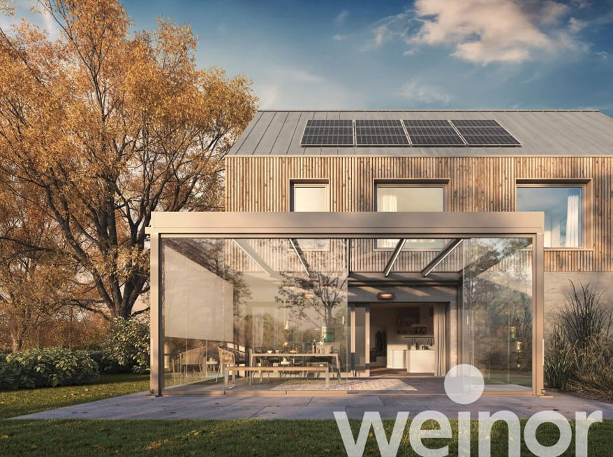 Terrazza Pure, le nouveau toit de terrasse en verre de weinor séduit par sa forme de toit cubique moderne associée à une structure innovante pour combiner lumière et protection contre les intempéries.