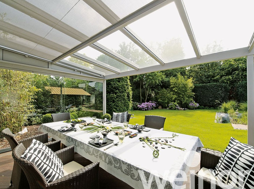 Le store de véranda sur toiture WGM Top offre une place agréablement ombragée sur votre terrasse ou dans votre véranda, pour y profiter des journées ensoleillées.